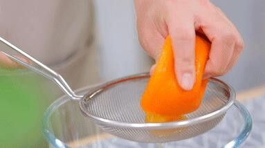 先将橙子揉软,然后剪开顶部,挖出果肉,然后过滤出55克的橙汁。