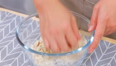 在橙汁中加入普通面粉、酵母、糖,将所有食材搅拌成絮状。接着揉成光滑的面团。