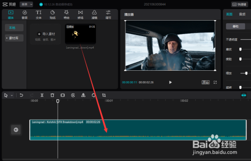 启动剪映并在新建的草稿项目中从媒体窗口中选择一段视频素材拖到时间轴面板中,如图所示。