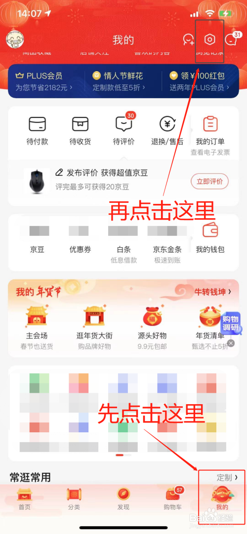 进入京东主页面后先点击右下方“我的”,再点击右上方设置图标,进入设置页面。