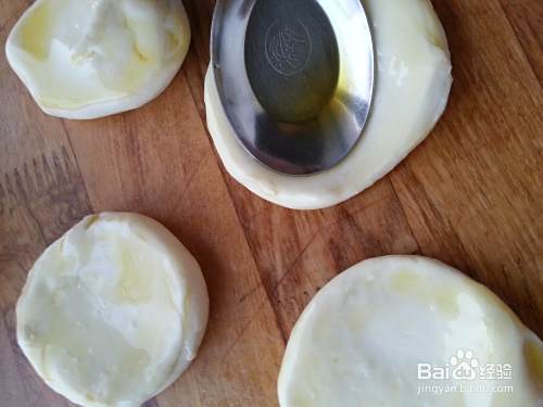 取个小勺,蘸油分别按压面剂,压成饼状。