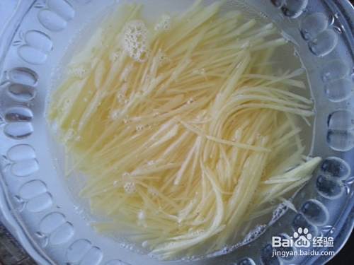 切好的土豆丝放入清水中浸泡,去除淀粉。备用。