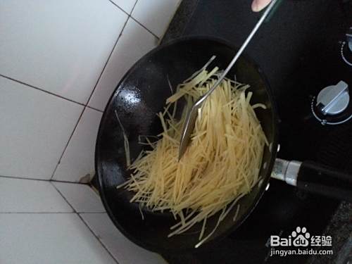 取锅,加油。将土豆丝下入翻炒。