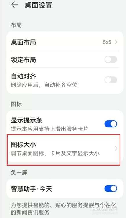 进入图标大小,向左或者向右调节按钮即可调整图标大小。