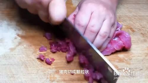 把韭菜清洗干净后捞出控干水分,猪肉切成颗粒状,剁成肉末,装入碗内。