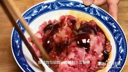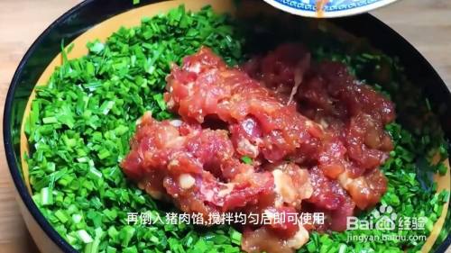 把韭菜控干水分,肉剁成肉末,装入碗内,加入调料搅拌腌制15分钟。韭菜切碎末,放食用油,再倒肉馅,搅拌均匀即可。