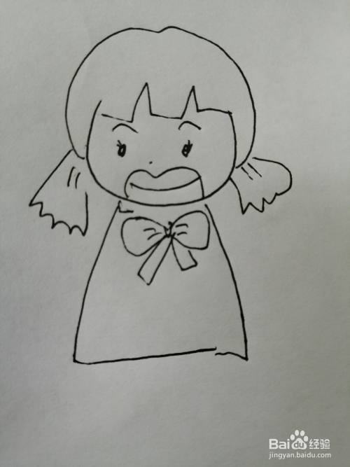 第五步,然后继续画出聪明的小女孩的漂亮的小裙子,注意裙子上蝴蝶结的画法。