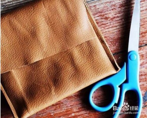 按图折叠皮革,缝好包包的两侧边,还有口袋底部,再修剪整齐两边多余的皮革。