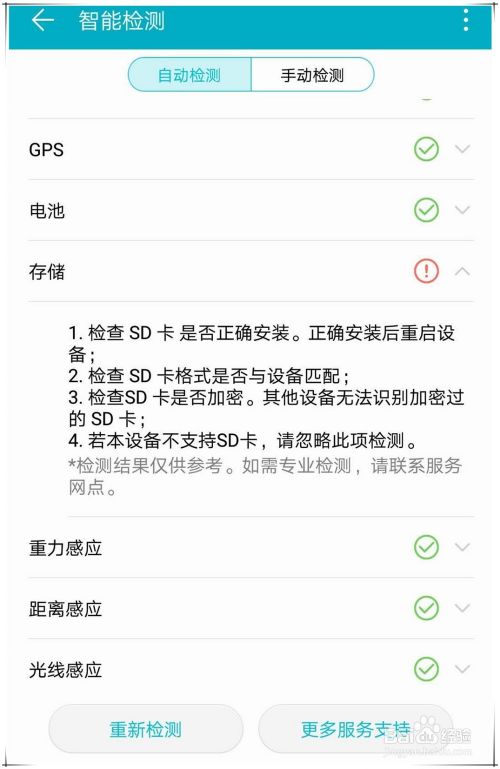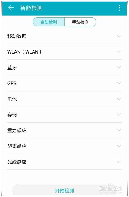 在智能检测页面,可以进行“自动检测”和“手动检测”两种类型的检测。其中 自动检测可以对移动数据、WLAN、蓝牙、GPS、电池、存储、重力感应、距离感应、光线感应等项,自动进行检测报告。大家可以根据报告建议进行修理或优化。