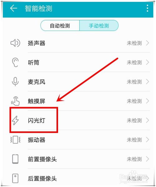 手动检测,需要手动进行配合检测,如小编的手电筒不亮,那么就可以选择“闪光灯”进行手动检测。