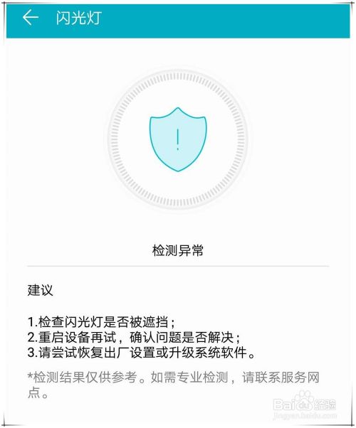 在打开的闪光灯检测窗口,按照提示点击上面的图片,点击后,程序会要求你选择闪光灯是有光亮,如果选择没有,它就会报异常,并提示异常排除建议。小编就是根据提示,重启手机恢复正常的。如果大家其它部件有问题,则可以利用相同的方法进行检测排除。