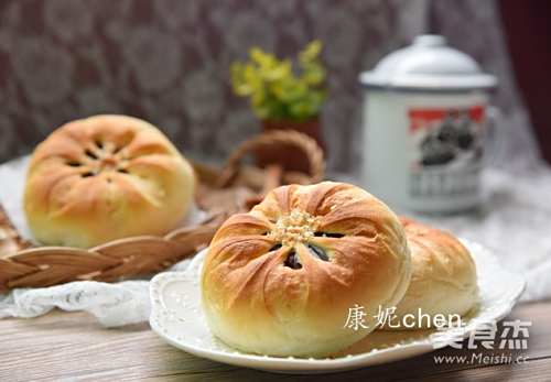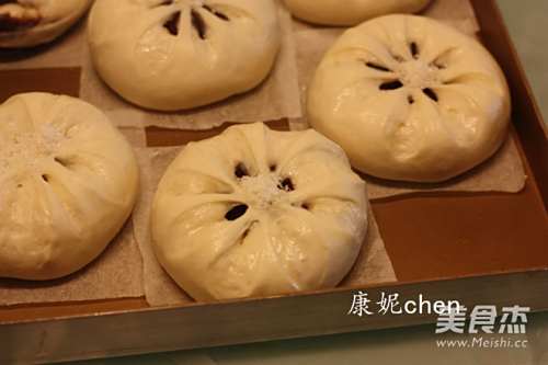 8当面团发酵原来的2倍时,完成最后发酵,在小面团中间撒些椰蓉做花心