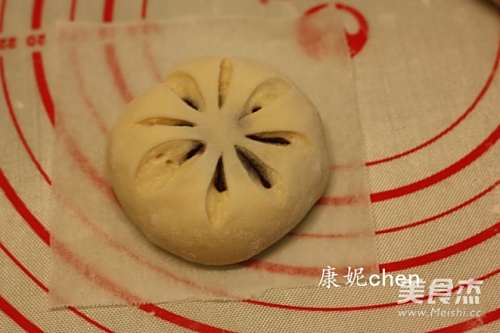 6面团封口收紧,压扁擀平,在表面割八刀做成花型
