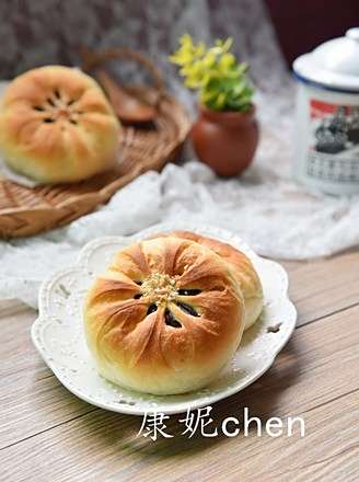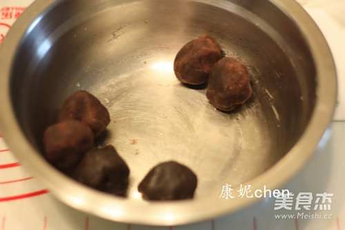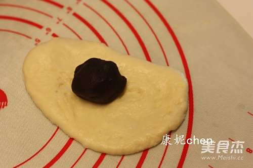 5把小面团擀成圆形,翻面,包入红豆沙馅料