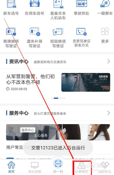 2、在首页,点击底部导航栏中的“办事网点”。