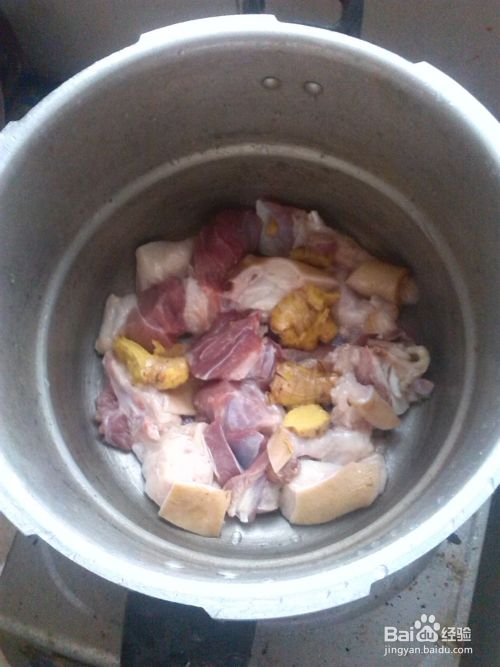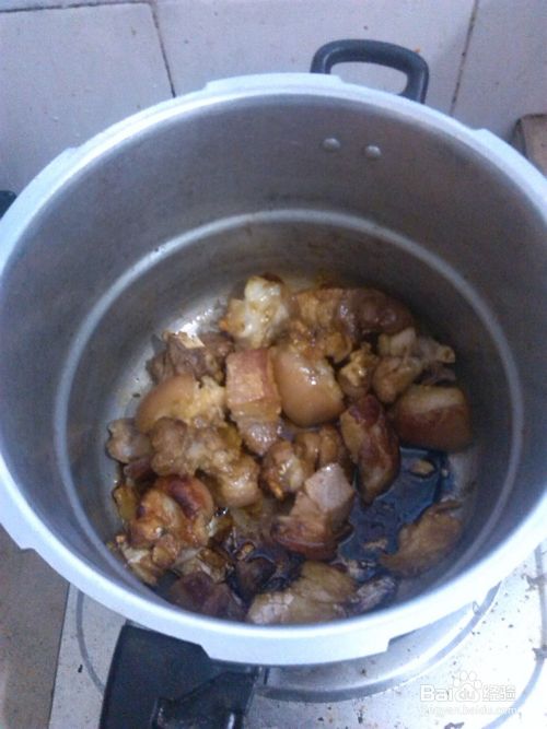 入锅:将腌制好的猪脚倒入高压锅中,最好带肥肉的放在最下面,盖上锅盖。