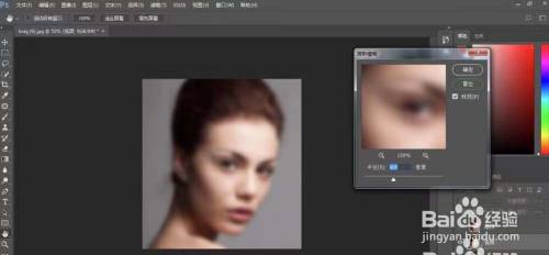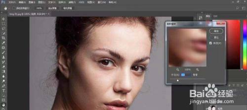 先隐藏高频层,选中低频层,点击滤镜-模糊-高斯模糊,移动半径滑块到看不清人物眉毛或睫毛为止,这里设置半径为9像素。