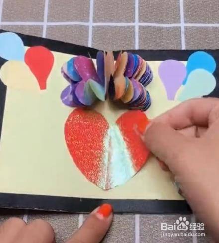 然后把它粘在贺卡里面,在旁边点缀一些小装饰,在贺卡的外面粘上一个花的形状,这样一个贺卡就做出来了。
