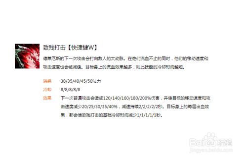 非常强大的被动技能,因为它可以很多持续伤害并且可以强化你的其它技能。对于W技能来说,每一层被动都能降低它的冷却时间1秒,叠满5层的话,W技能冷却只有3秒了。相当于一个削弱版的点燃