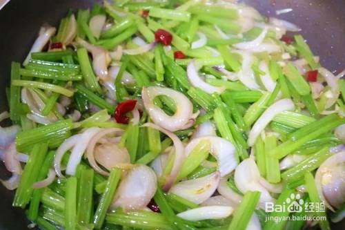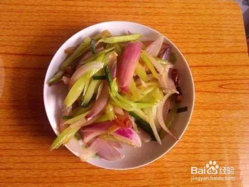 锅内倒入少许油,放入葱花炒香,放入山野芹翻炒2分钟后放入紫洋葱丝翻炒2分钟。