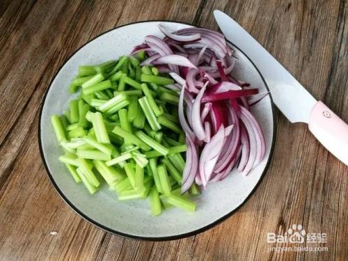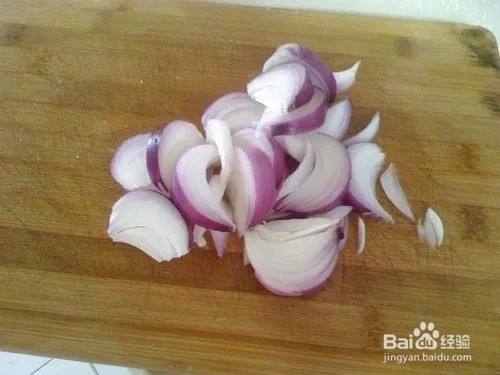 紫洋葱剥皮后洗净,切成洋葱丝备用。