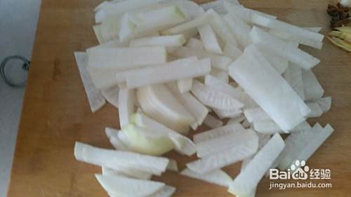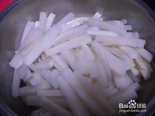 接下来,将白萝卜用刀切成一个个的小萝卜条,盛入盘中,并在上面撒些食用盐。
