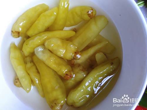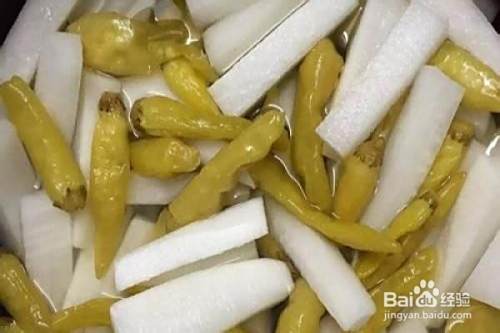再次,将买回来的泡椒从包装袋中取出来,然后和白萝卜条一起搅拌均匀,散入适量的白糖,倒入一定量的白醋搅拌均匀。
