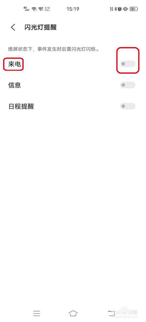 点击来电右面开关,将开关置于开启状态。再来电时,后置闪光灯会闪烁。