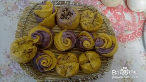最后剩面做了几个玫瑰花馒头和南瓜馒头,并且将核桃仁包到馒头中做馅。