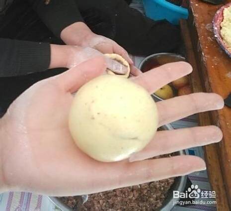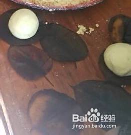 将一小面团拍至薄厚均匀,大小适中的皮,放入适量红芸豆,封好,团至圆形,放在梨树叶上即可