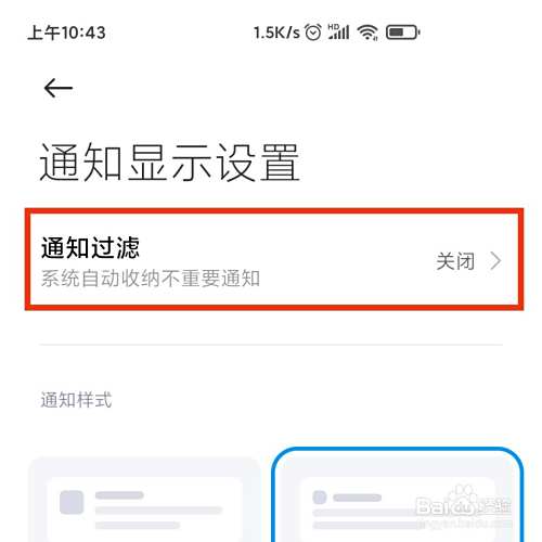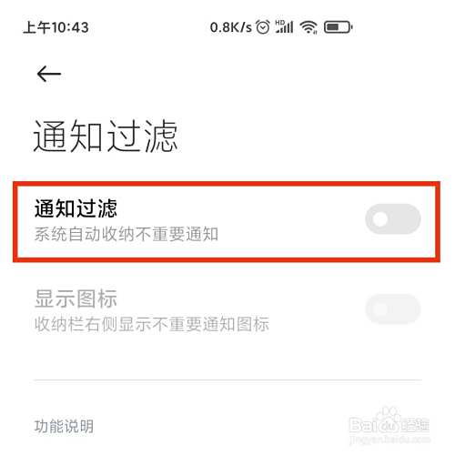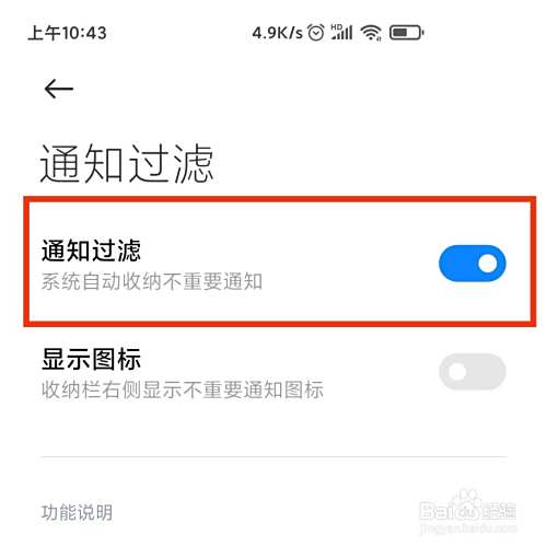 最后如图所示,通知过滤的滚轮显示开启,就可以开启系统自动收纳不重要的通知。
