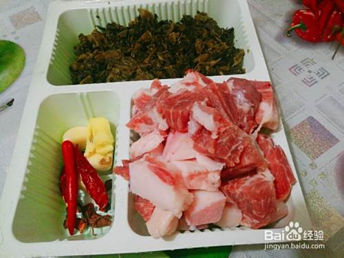 1.把所有食材都处理好,五花肉切块,梅菜干泡发,其他配料过下水就好。