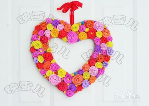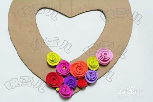 把做好的玫瑰和涡形卷粘贴到心形纸板上。完成。