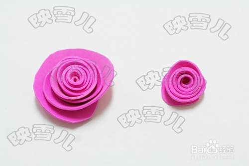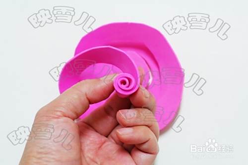 将海绵纸裁成长三角形做成涡形卷,用来填玫瑰间的空隙。