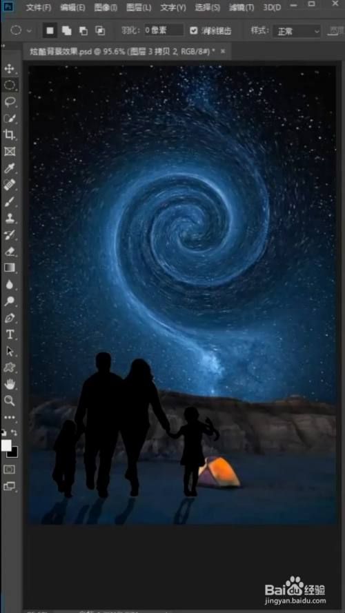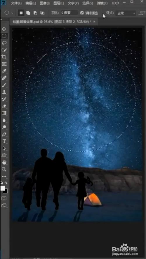 打开photoshop,然后点击使用椭圆选框工具,在天空画出一个圆。
