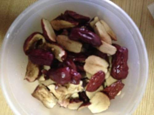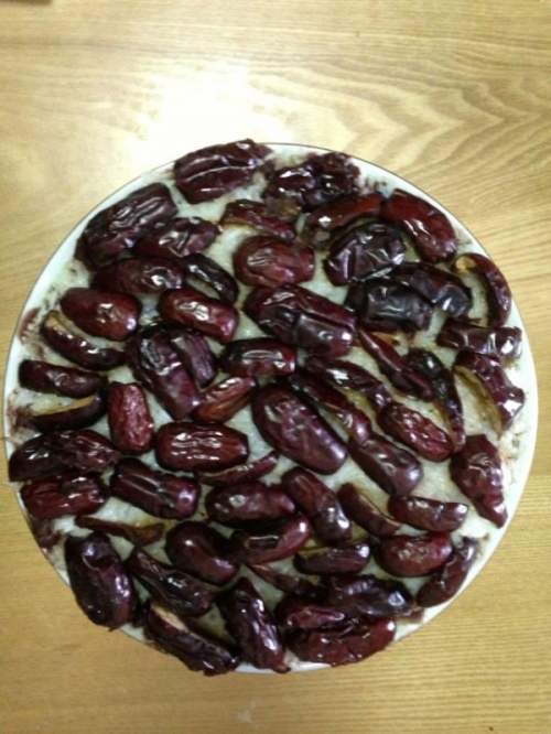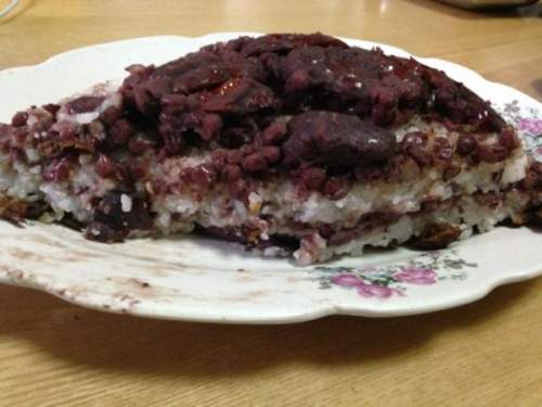 6红豆上放糯米饭,依次再放蜜红豆和糯米饭,最上面放枣