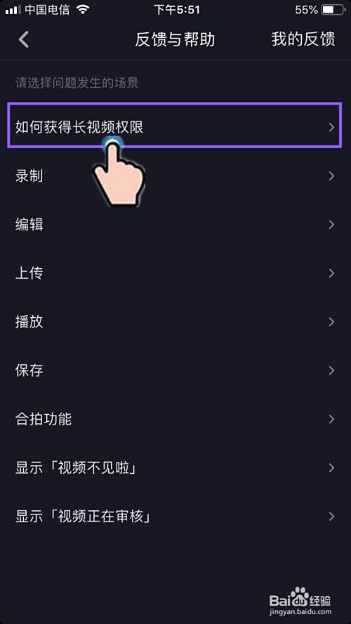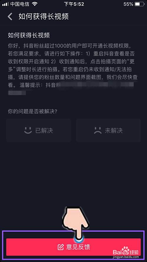 答:提供本账号的粉丝数量截图(在“我的”中查看)以及问题界面截图(也就是无法拍摄长视频的操作界面截图),点击底部的【意见反馈】,提交上述两个截图以及文字描述,等待回复。