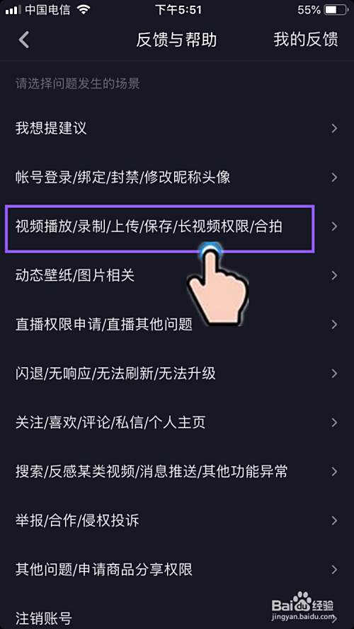step3、选择问题的发生场景,根据标题我们就可以看出应该点击哪个,点击下图中所标识的问题场景进入【视频播放、录制、上传、保存、长视频权限、合拍】等都是在这个场景里设置的。
