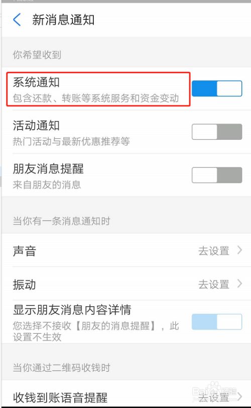 第五步,进入新消息通知菜单后,打开系统通知的使能开关,这样账户还款、转账和资金变动后就能及时收到消息;