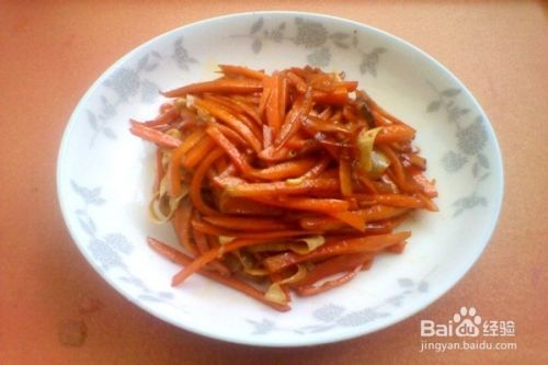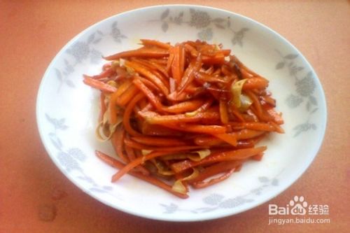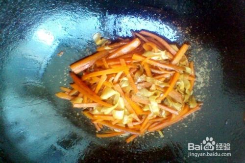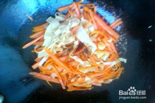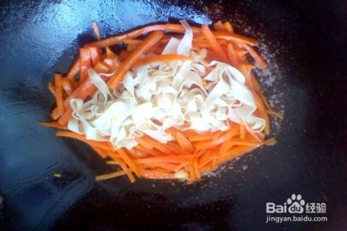 盛起,装入盘中。这样,一盘色香味俱全的胡萝卜炒豆皮就做好了。