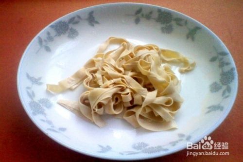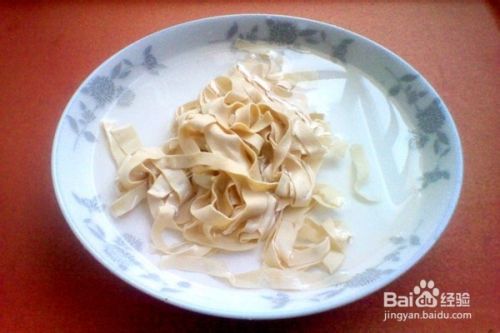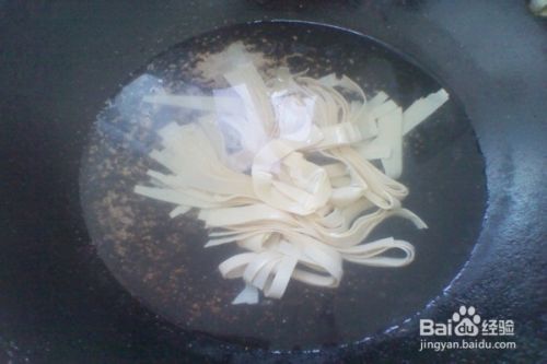 等锅中的水烧滚后,把切好的豆皮倒入锅中,让豆皮在锅中煮1分钟左右的时间,