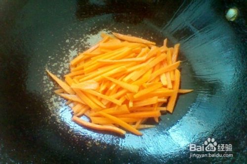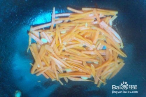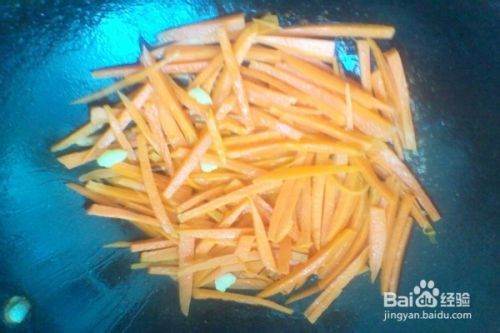 在闻到大蒜炸香的时候,把盘中准备好的胡萝卜丝倒入锅中,翻炒几下,