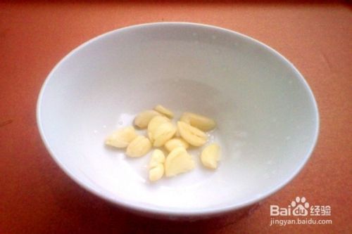 取1个大蒜,清洗干净,把大蒜掰成一瓣一瓣的,用刀背把大蒜拍碎后,剥去外皮,放入碗中待用。