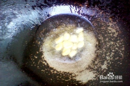 等锅中的油烧热的时候,把盘中准备好的大蒜倒入锅中,翻炒几下。