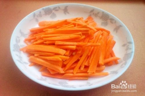 先把胡萝卜切成小块,然后切成片状,最后切成丝状放入盘中。