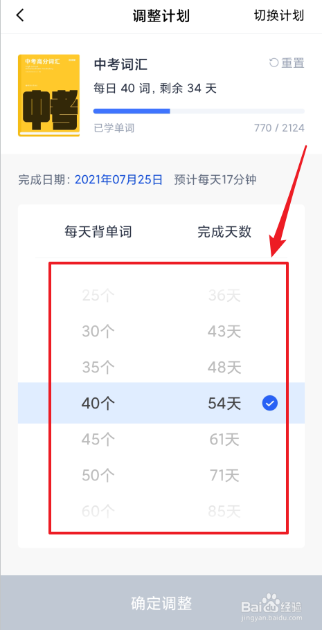 在“调整计划”界面,对每天背单词个数和完成天数进行调整。见下图
