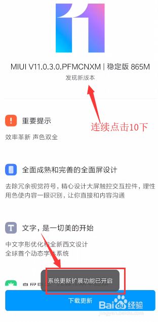 我们只需要连续点击10下稳定版的图标,一直到下面弹出提示,扩展功能已开启。