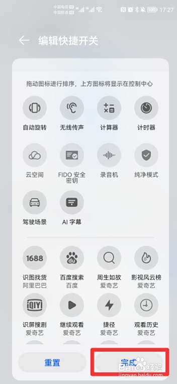 在编辑快捷开关界面中,选择拖动图标并点击完成即可。