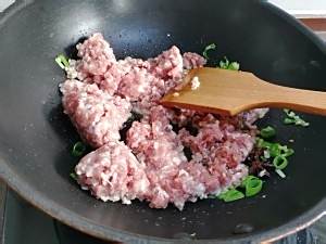 炒锅放油烧热后下葱姜末和大料,煸出香味后下入肉馅,加料酒中火翻炒。