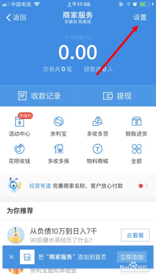 这样就会进入 商家服务 的页面。在这个页面中点击右上角的 设置 。